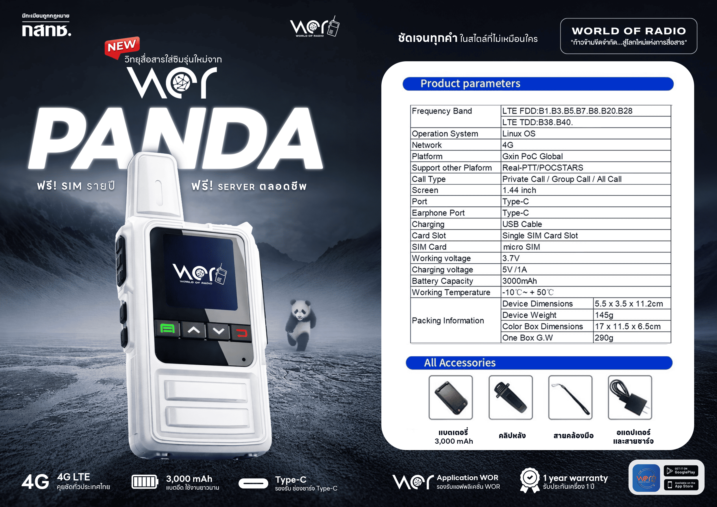 Wor Panda เสปคเครื่อง วิธีจัดการระบบ WOR ด้วยตัวเอง 🐼 WOR Panda วิทยุสื่อสารใส่ซิม 4G ระบบอินเทอร์เน็ต สื่อสารครบ คุ้ม ใช้งานง่าย พร้อมลุยทุกงาน เหมาะสำหรับงานสื่อสารในองค์กร • โรงแรม • ร้านอาหาร • คลังสินค้า • หน้างานก่อสร้าง และอื่น ๆ WOR PANDA 4G SIM วิทยุสื่อสารใส่ซิม 4G | ระบบสื่อสารผ่านอินเทอร์เน็ต ใช้งานระบบ WOR แบบ Free Server ตลอดชีพ ความปลอดภัยทางข้อมูลสูง เหมาะกับทุกองค์กรที่เน้นการสื่อสาร ใช้งานได้ทั้งแบบกลุ่ม และส่วนตัว แบตเตอรี่ 3,000 mAh ใช้งานได้ยาวนาน ช่องชาร์จ Type-C รับประกันสินค้า 1 ปี 🎁 แถมฟรี! SIM รายปี GOMO AIS จำนวน 1 ปี 📌 เงื่อนไขการ Activate เครื่องหลังจากสั่งซื้อ กรุณาแจ้งชื่อเครื่อง ชื่อกลุ่มใช้งาน ทางช่องแชท⚠️ ตัวเครื่องจะไม่สามารถใช้งานได้ หากยังไม่ทำการ Activate วิธีจัดการระบบ WOR ด้วยตัวเอง ระบบ WOR ถูกออกแบบให้ผู้ใช้งานสามารถบริหารจัดการได้เองผ่านระบบหลังบ้าน โดยไม่จำเป็นต้องพึ่งช่างเทคนิค ดาวน์โหลดคู่มือแบบ PDF ขั้นตอนการลงทะเบียนการใช้งาน WOR วิธีแก้ไขชื่อเครื่อง > วิธีนำเข้ากลุ่มใช้งาน > วิธีเพิ่มกลุ่ม facebook fanpage แอดไลน์ ติดต่อ Callcenter