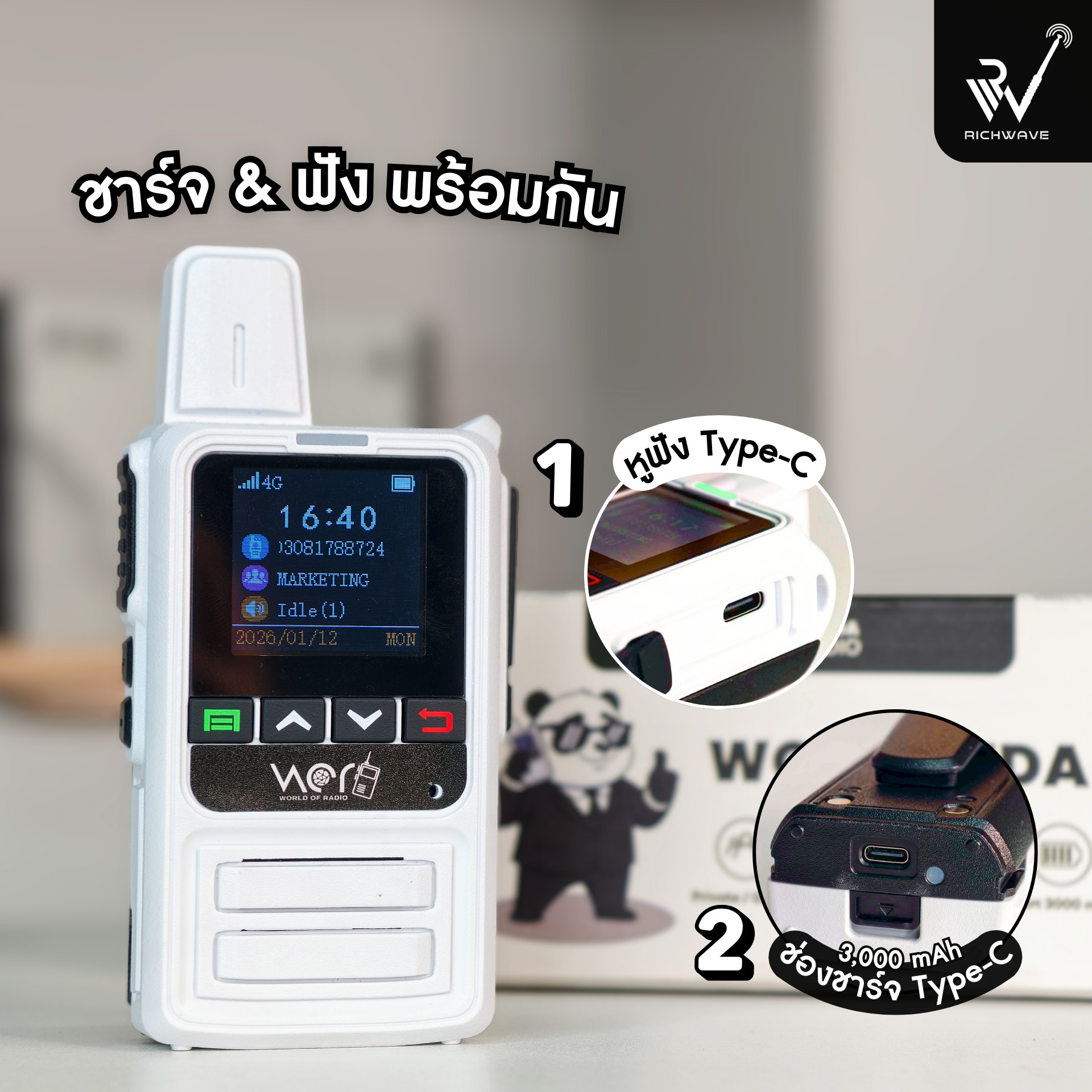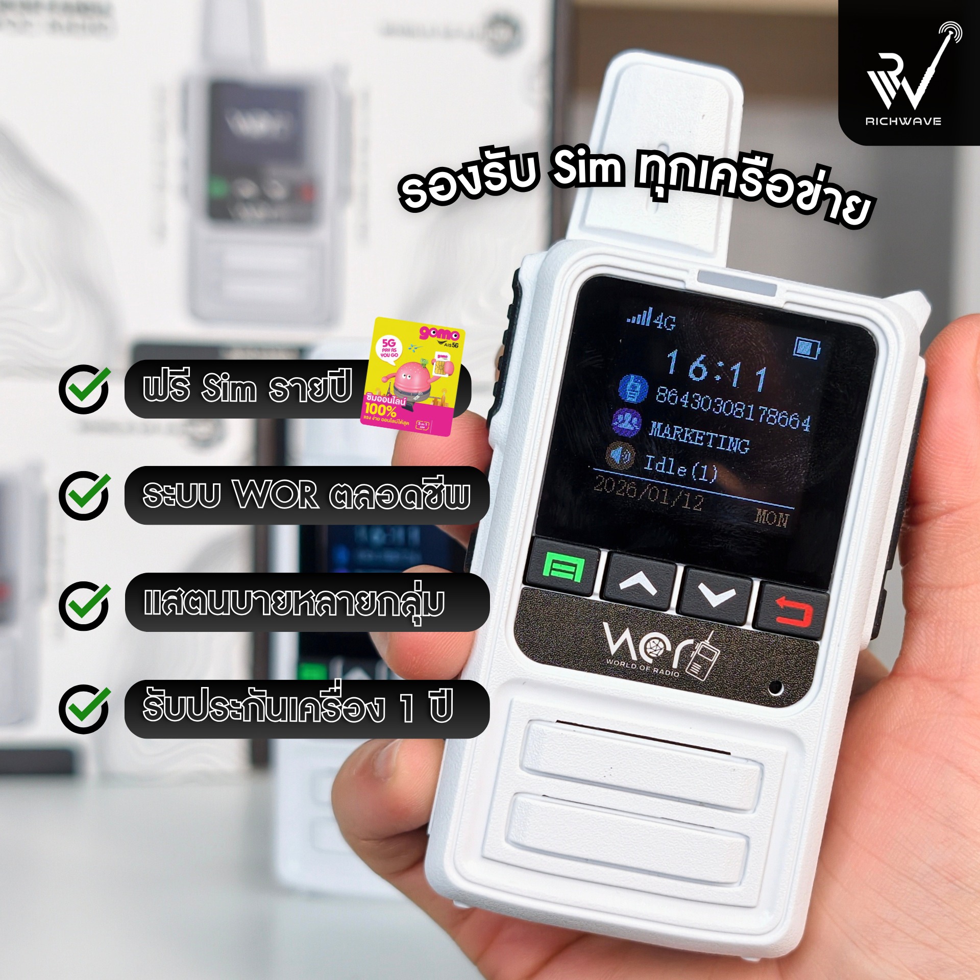 Wor Panda เสปคเครื่อง วิธีจัดการระบบ WOR ด้วยตัวเอง 🐼 WOR Panda วิทยุสื่อสารใส่ซิม 4G ระบบอินเทอร์เน็ต สื่อสารครบ คุ้ม ใช้งานง่าย พร้อมลุยทุกงาน เหมาะสำหรับงานสื่อสารในองค์กร • โรงแรม • ร้านอาหาร • คลังสินค้า • หน้างานก่อสร้าง และอื่น ๆ 📌 เงื่อนไขการ Activate เครื่อง หลังจากสั่งซื้อ กรุณาแจ้งชื่อเครื่อง ชื่อกลุ่มใช้งาน ทางช่องแชท ⚠️ ตัวเครื่องจะไม่สามารถใช้งานได้ หากยังไม่ทำการ Activate WOR PANDA 4G SIM วิทยุสื่อสารใส่ซิม 4G | ระบบสื่อสารผ่านอินเทอร์เน็ต ใช้งานระบบ WOR แบบ Free Server ตลอดชีพ ความปลอดภัยทางข้อมูลสูง เหมาะกับทุกองค์กรที่เน้นการสื่อสาร ใช้งานได้ทั้งแบบกลุ่ม และส่วนตัว แบตเตอรี่ 3,000 mAh ใช้งานได้ยาวนาน ช่องชาร์จ Type-C รับประกันสินค้า 1 ปี 🎁 แถมฟรี! SIM รายปี GOMO AIS จำนวน 1 ปี ** หลังจากสั่งซื้อ รบกวนแจ้งชื่อเครื่องและชื่อกลุ่ม สำหรับ Activate เครื่อง ทางช่องแชท ตัวเครื่องจะไม่สามารถใช้งานได้หากยังไม่ทำการ Activate ** วิธีจัดการระบบ WOR ด้วยตัวเอง ระบบ WOR ถูกออกแบบให้ผู้ใช้งานสามารถบริหารจัดการได้เองผ่านระบบหลังบ้าน โดยไม่จำเป็นต้องพึ่งช่างเทคนิค ดาวน์โหลดคู่มือแบบ PDF ขั้นตอนการลงทะเบียนการใช้งาน WOR วิธีแก้ไขชื่อเครื่อง > วิธีนำเข้ากลุ่มใช้งาน > วิธีเพิ่มกลุ่ม facebook fanpage แอดไลน์ ติดต่อ Callcenter